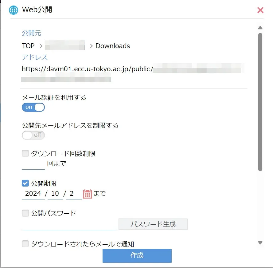 3. 設定画面が表示されるので,メール認証や公開期限等を設定してください.表示されているリンクをコピーし「作成」を押してください.