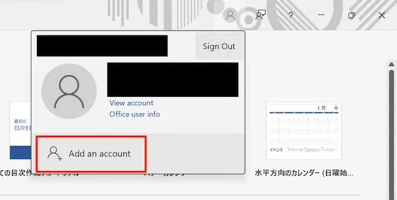 You are signed in with a Microsoft account in the Office app. Click the person icon in the upper right and check the account you are currently signed in with. If you are signed in with a different account other than UTokyo Account, select “Add an account.”