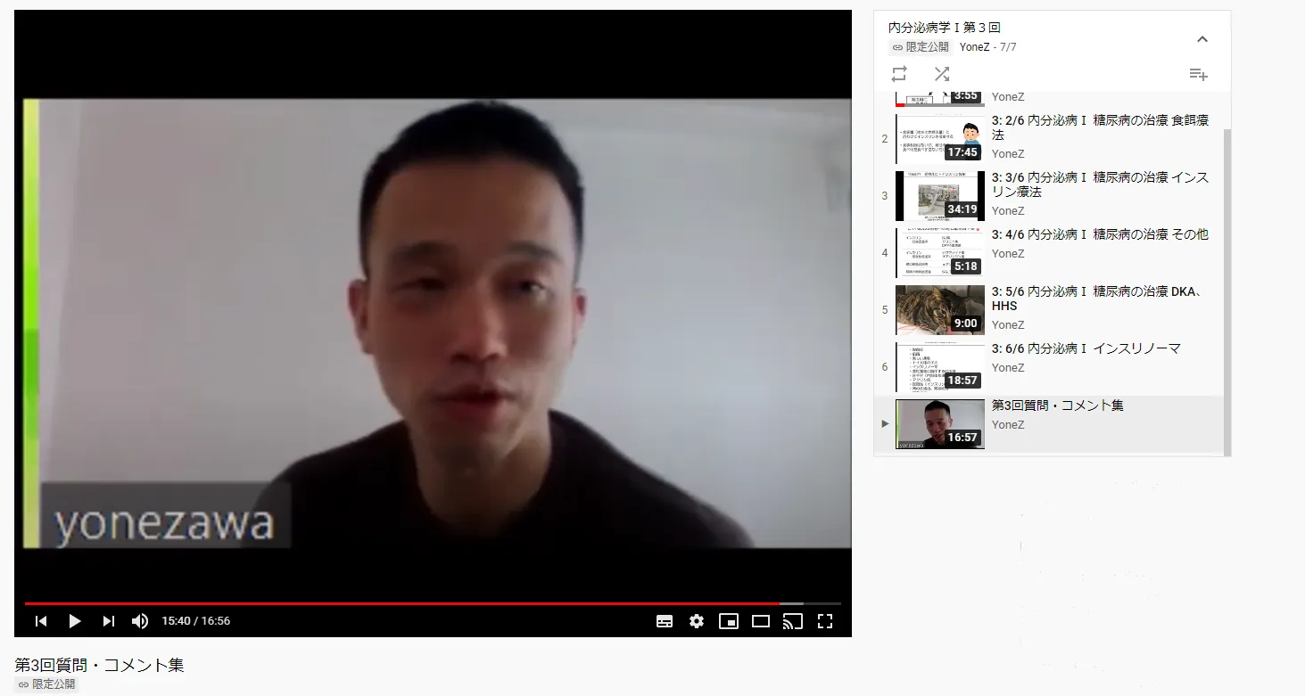 講義動画のオンデマンド配信とリアルタイムの授業の「二刀流」は、今後の講義のあり方として良いのではないか、という感触があります。この手応えには、「内分泌病学」という科目が獣医のライセンス教育に関わるものであり、指導要領的な教科書が存在し、到達目標が明確であることも関係していると思います。 可能であれば、一度作った講義動画は、必要に応じてアップデートしつつ使い続けていきたいです。なかでも、10 年以上前から変わらない内容については、年度ごとの授業のクオリティのばらつきをなくして、良い動画を安定して学生に提供したいです。オンデマンド配信の長所を利用していこう、という雰囲気が生まれているのは、良いことだと思っています。