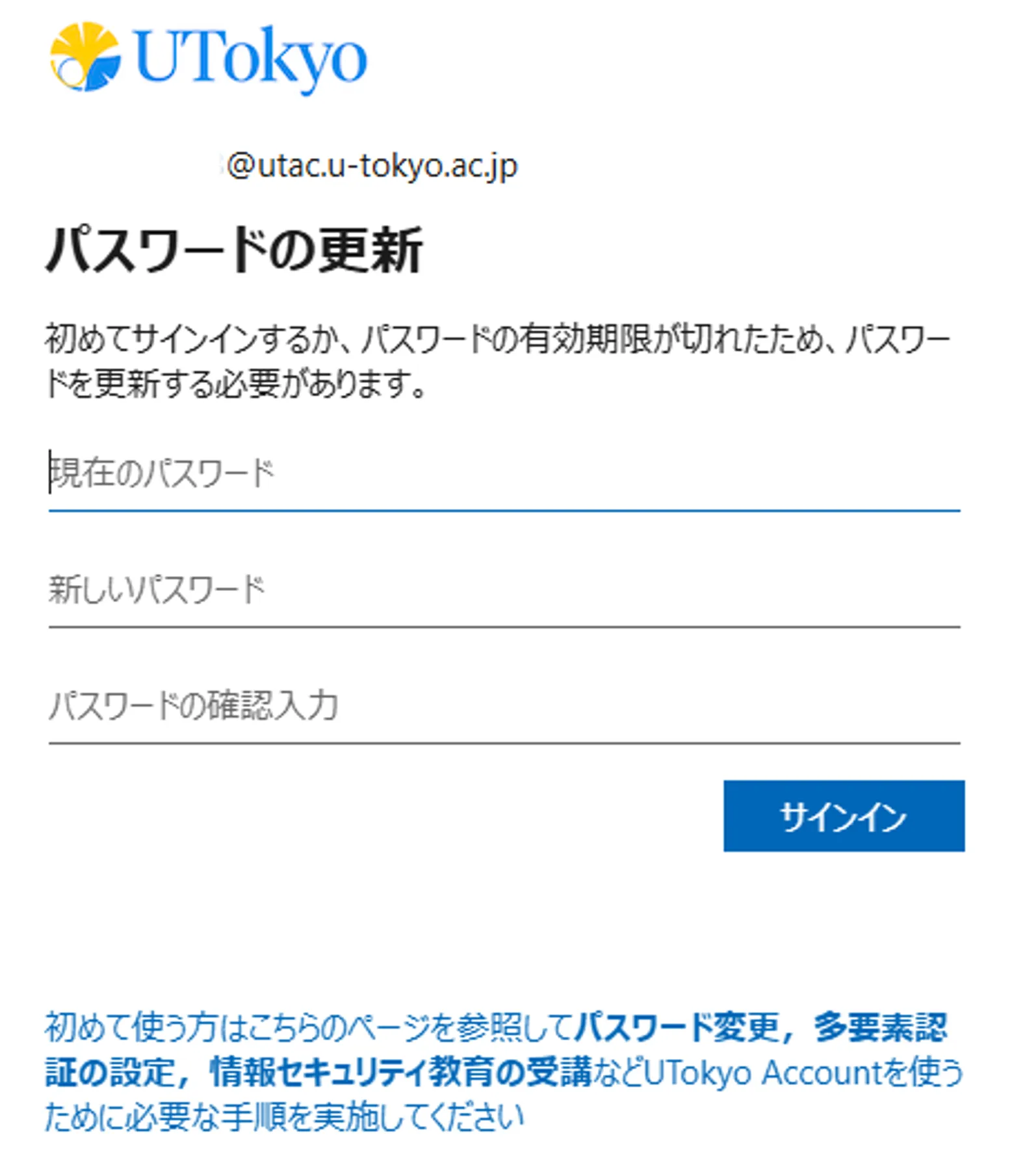 6. サインイン画面が表示されたら,UTokyo Account(10桁の共通ID+@utac.u-tokyo.ac.jp)と仮パスワードを入力してください.