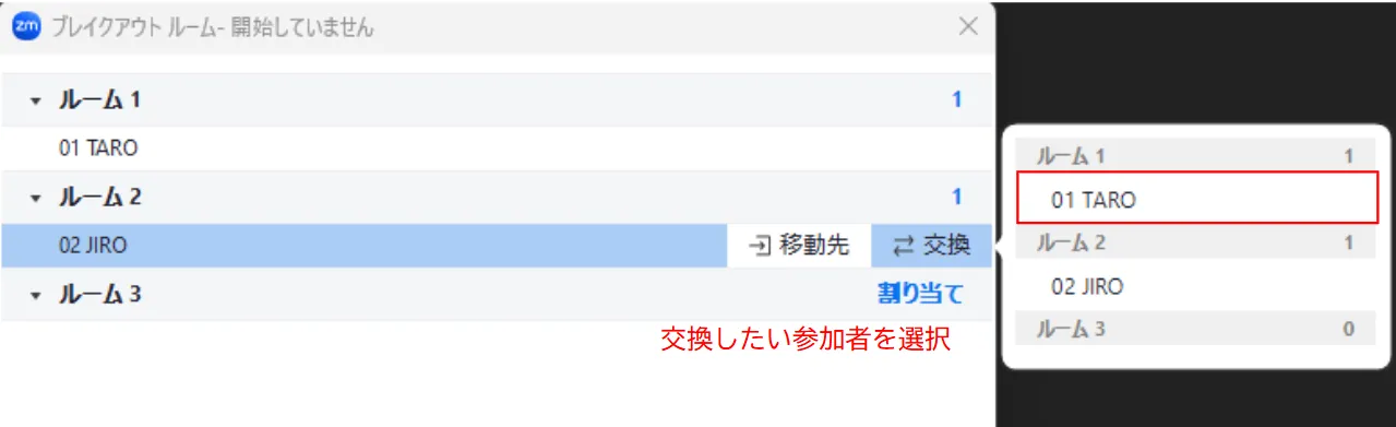 いずれの方法で割り当てを行っても,割り当てた後に,特定の参加者を別のルームに移動させることや,別の人と交換することが可能です.