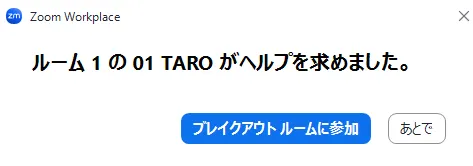 ブレイクアウトルームで何らかの問題が生じた場合,ブレイクアウトルームの参加者はホストに対してルームに参加するようにヘルプを求めることができます.ホストはそのリクエストに応答して,そのブレイクアウトルームに参加することができます.
