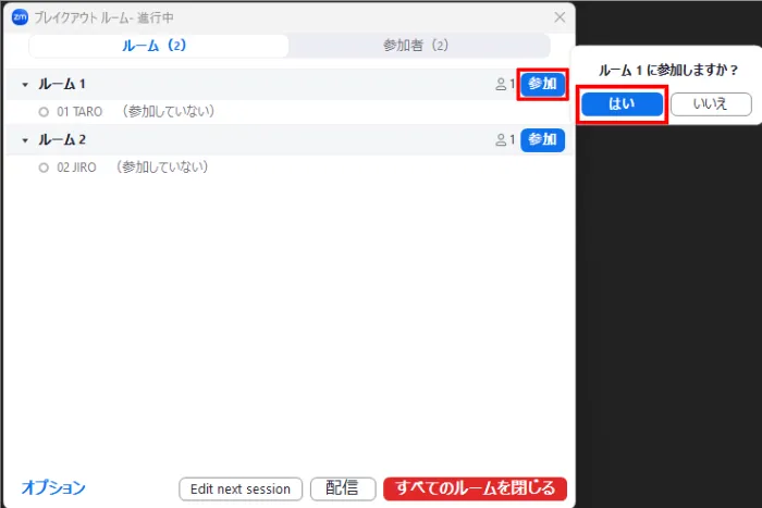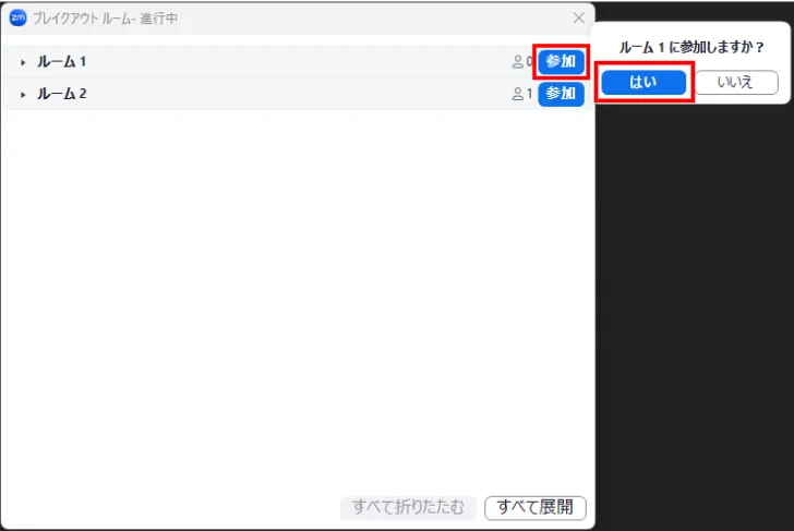 2. 現在開かれているブレイクアウトルームの一覧が表示されるので,参加したいルームの横にある「参加」を選択し,「はい」を押してください.