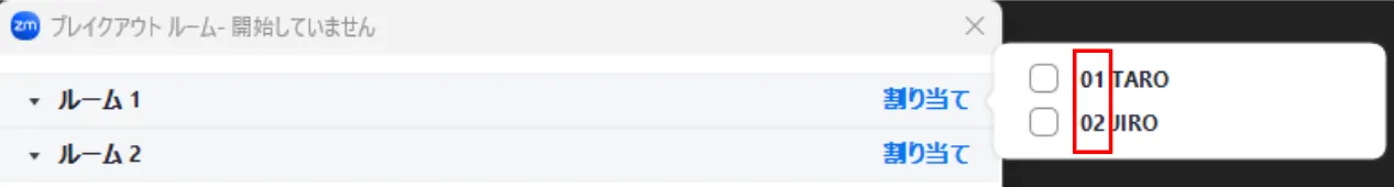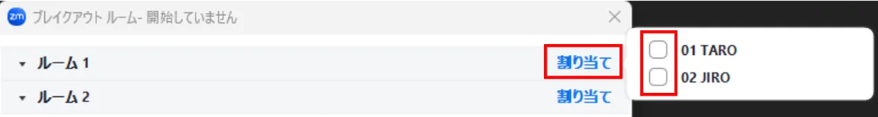 2. まだ割り当てられていない参加者の一覧が横に出るので,そのルームに割り当てたい参加者にチェックをつけて選択してください.
