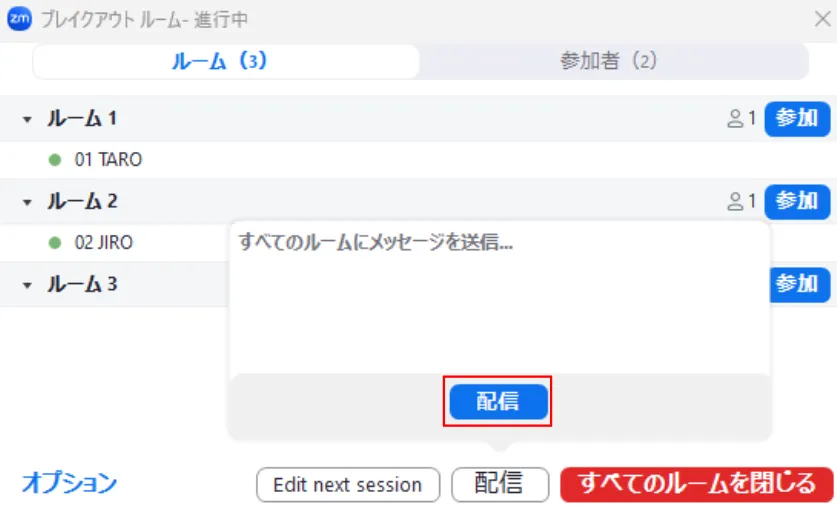 • 「メッセージを配信」する場合:送りたいメッセージを入力した後に,「配信」を押してください.送信されたメッセージは各ブレイクアウトルームで10秒間表示された後に消えます.