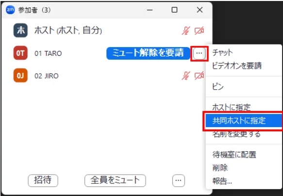 なお共同ホストは,以下で説明するブレイクアウトルーム実施中の操作について,ホストとほとんど同じ機能が使用可能です.ただし,後述する参加者からのヘルプに応答できるのはホストのみであり,共同ホストはヘルプを受け取れません.