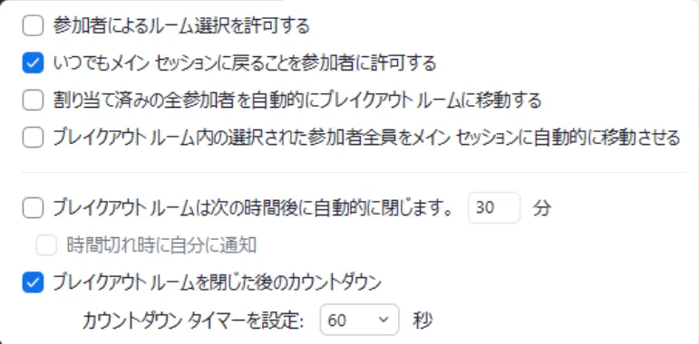 何も設定されていない場合,ホストの操作によってブレイクアウトルームが閉じられるか,予定された終了時間がきた時点で,参加者は直ちにメインミーティングに戻されます.