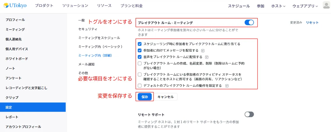 3. ブレイクアウトルームに関連する機能について,必要な項目をオンにしてください.